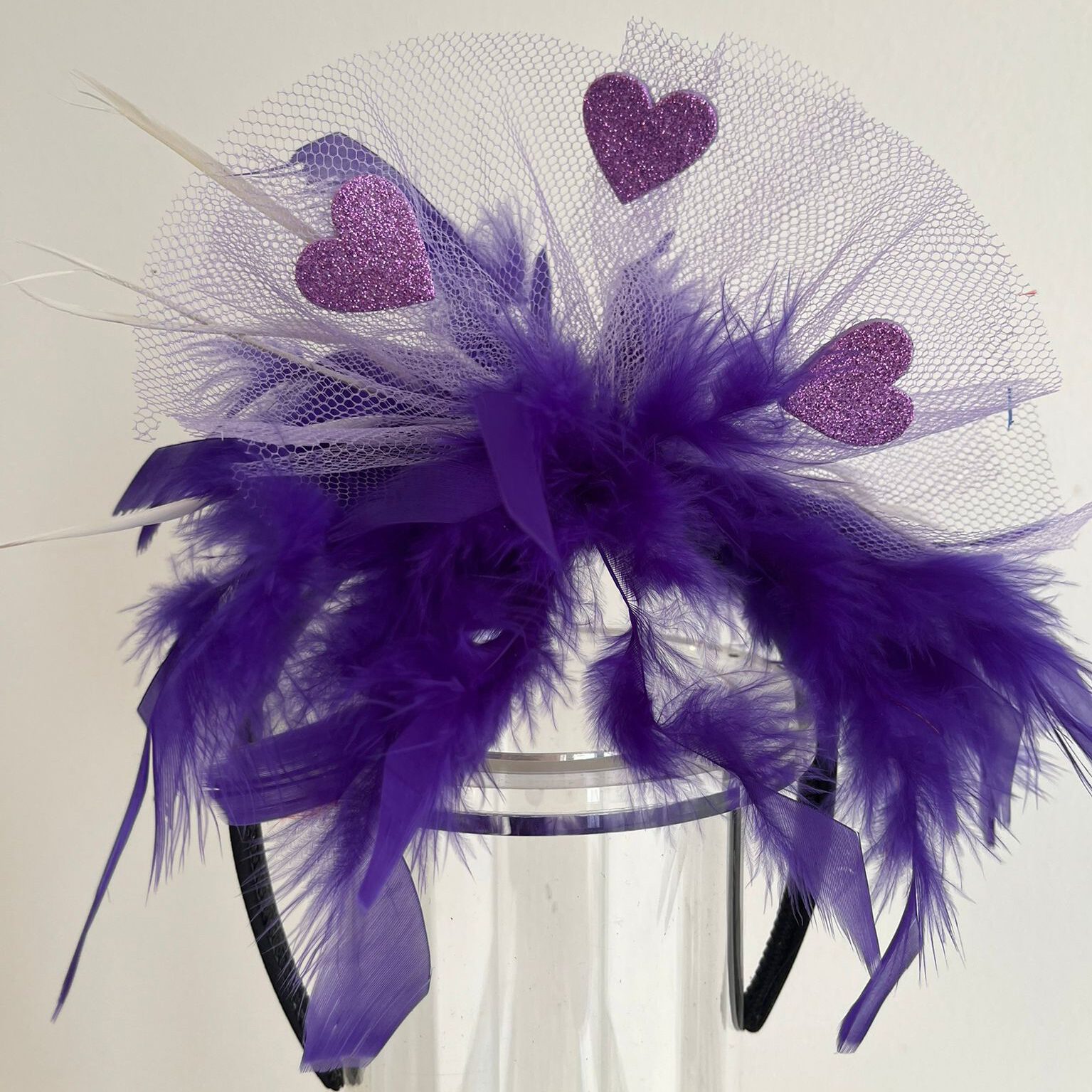 Haarreif mit lila Federn und Herzchen auf Tüll